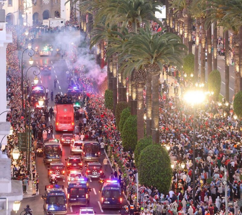 وجاب موكب “أشبال الأطلس” الحافلة المكشوفة المزيّنة بالألوان الوطنية وسط هتافات جماهيرية وأهازيج شعبية وزغاريد عمّت الأرجاء، بينما ازدانت شرفات المباني بالأعلام المغربية في مشهد مؤثر يجسد فرحة شعبية عارمة ووحدة وطنية حول المنتخب. ورد اللاعبون والطاقم التقني والإداري التحية للجماهير بحرارة، معبرين عن امتنانهم للدعم الواسع الذي حظوا به طوال مشوارهم المونديالي.